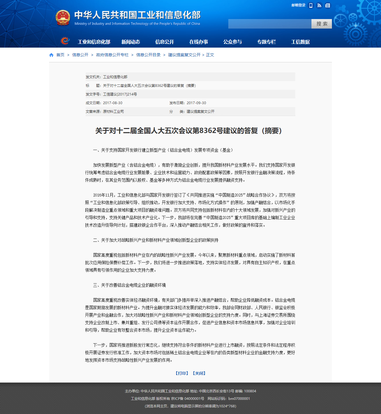 日前,國家工信部公開發(fā)布了《關于對十二屆全國人大五次會議第8362號建議的答復(摘要)》的文件,文件強調:鋁合金電纜是國家鼓勵發(fā)展的新材料產業(yè),支持國家開發(fā)銀行建立新型產業(yè)(鋁合金電纜)發(fā)展專項資金(基金),支持改善鋁合金電纜企業(yè)的融資環(huán)境。