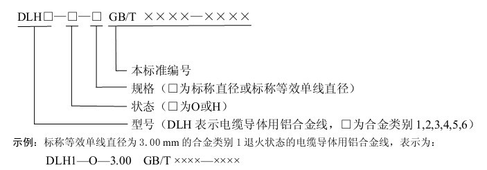 華星合金電纜根據(jù)企業(yè)標(biāo)準(zhǔn)規(guī)定型號以供客戶選擇,如ZC-TC90表示為AA8030合金導(dǎo)體交聯(lián)聚乙烯絕緣聚氯乙烯護套0.6/1kV電力電纜。即將頒布的國標(biāo)《低壓電纜用鋁合金線》中對型號做了新的規(guī)定,其規(guī)定如下圖: