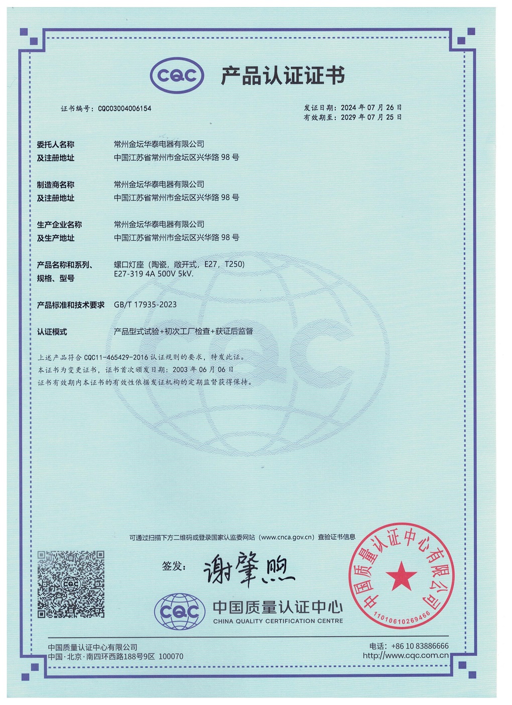 CQC證書螺口燈座E27-319中文版