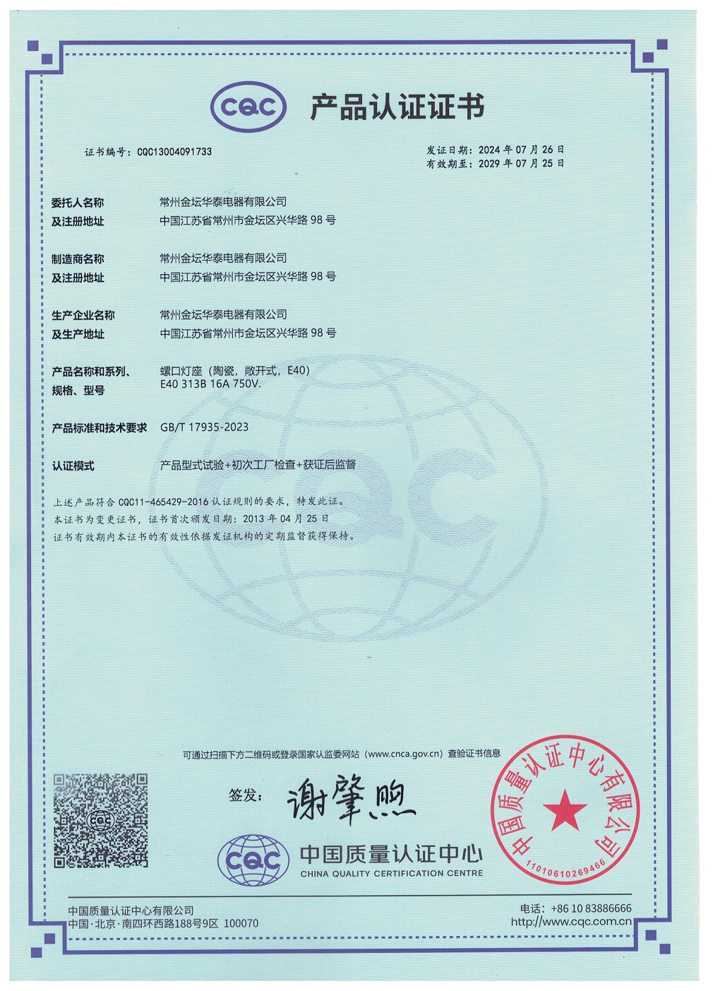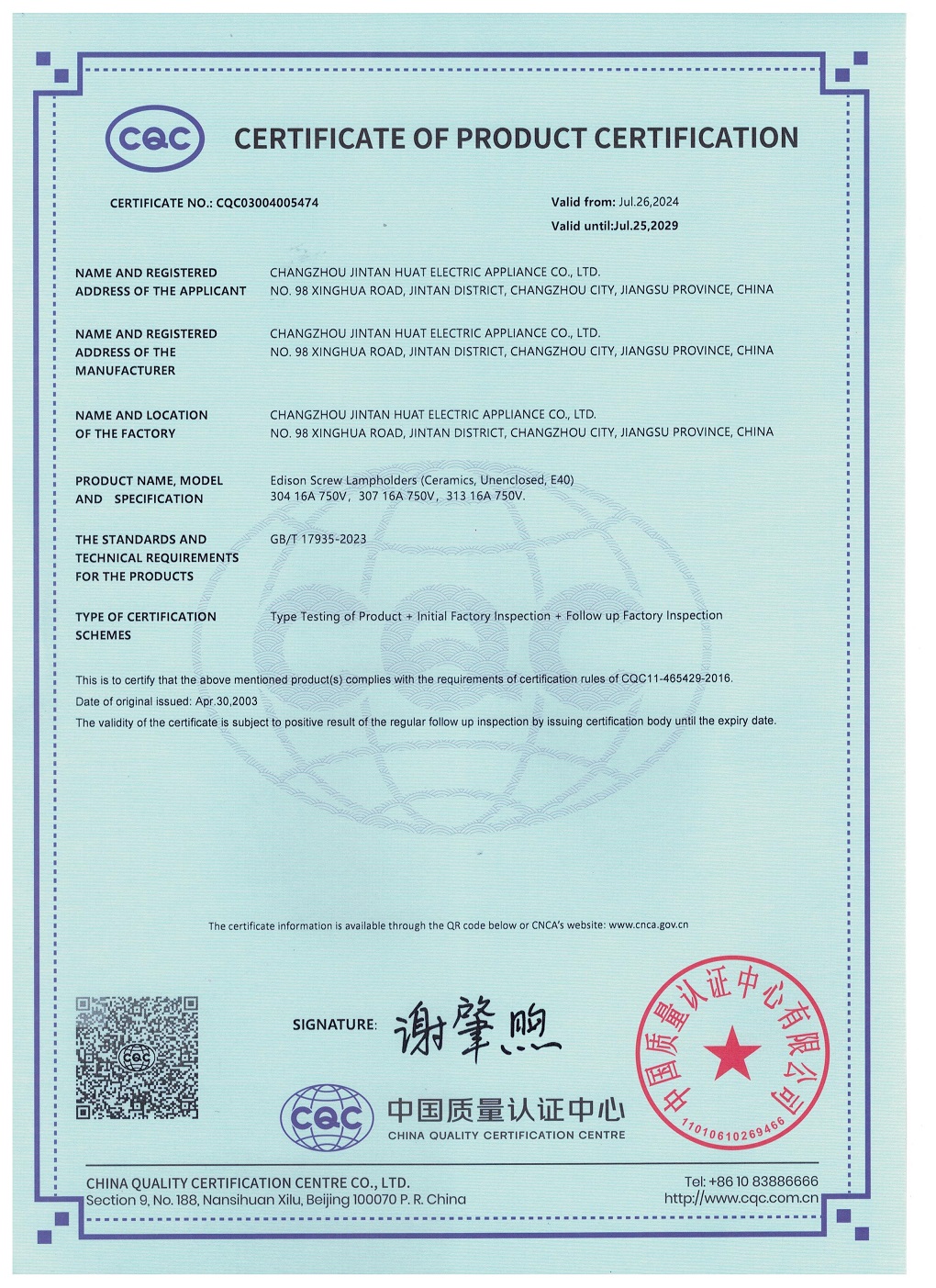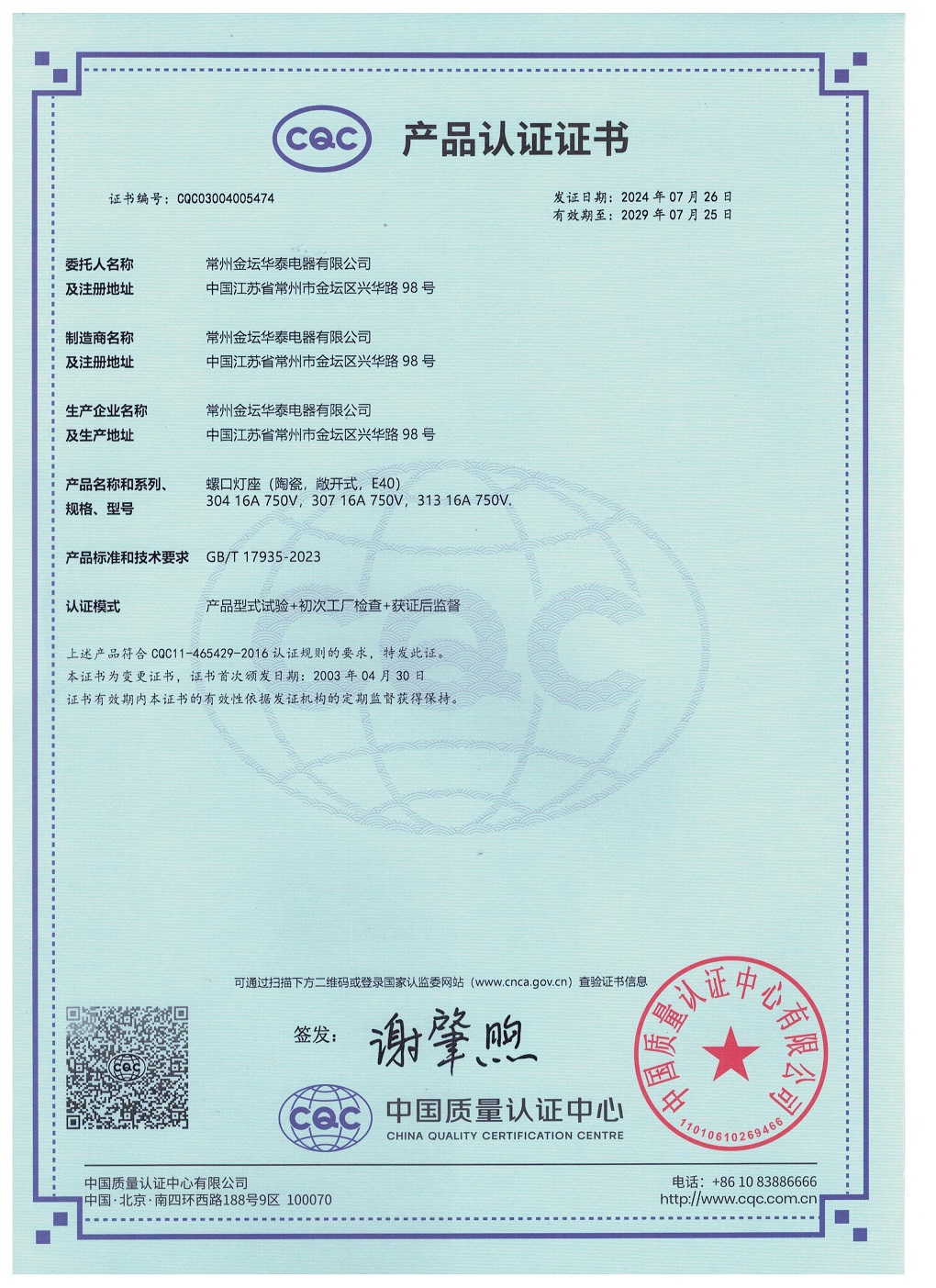 CQC證書螺口燈座E40 304 307 313英文版